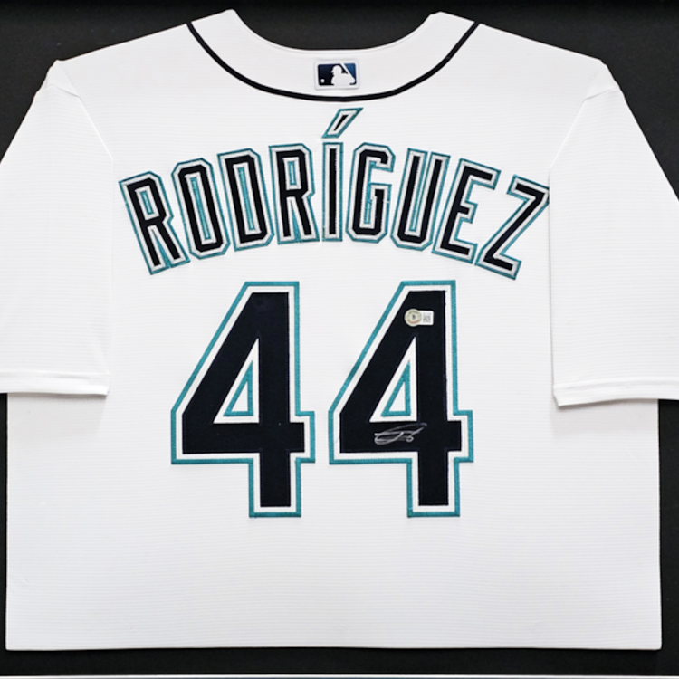 Any Mariner fan would love to take home a 31” x 36” framed white Nike Jersey hand signed by Julio Rodriguez, Seattle Mariner outfielder and American League Rookie of the Year.