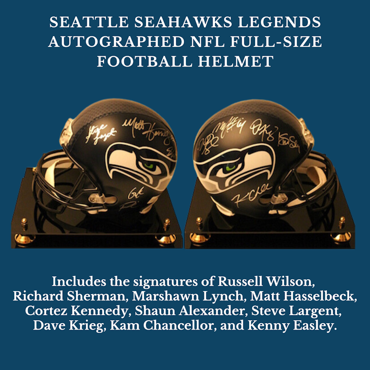 Own a piece of Seahawks history with this official NFL full-size football helmet, personally autographed by ten iconic Seahawks legends. This exceptional collection includes the signatures of Russell Wilson, Richard Sherman, Marshawn Lynch, Matt Hasselbeck, Cortez Kennedy, Shaun Alexander, Steve Largent, Dave Krieg, Kam Chancellor, and Kenny Easley.
